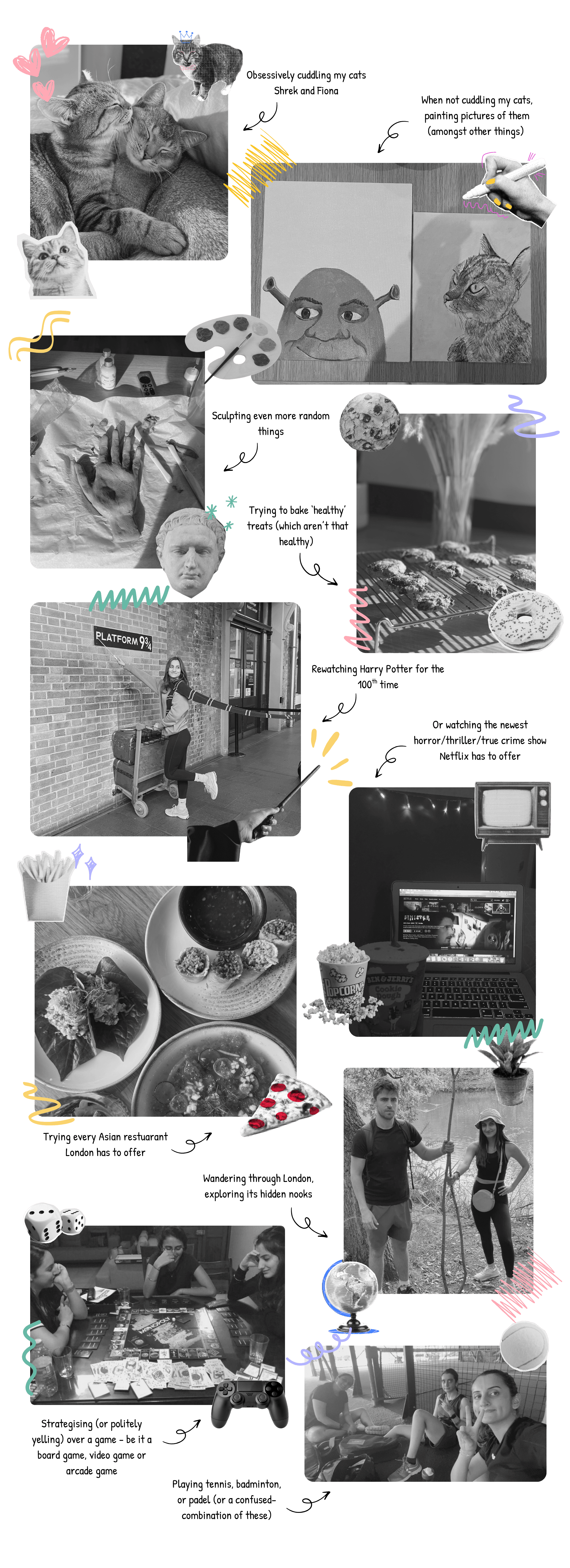 This theme carries over into my portfolio design. The clean black-and-white minimalist aesthetic reflects clarity and structure, while the hand-drawn elements add a bold, colourful, and creative touch. Together, they tell the story of someone who thrives on blending logic and imagination.