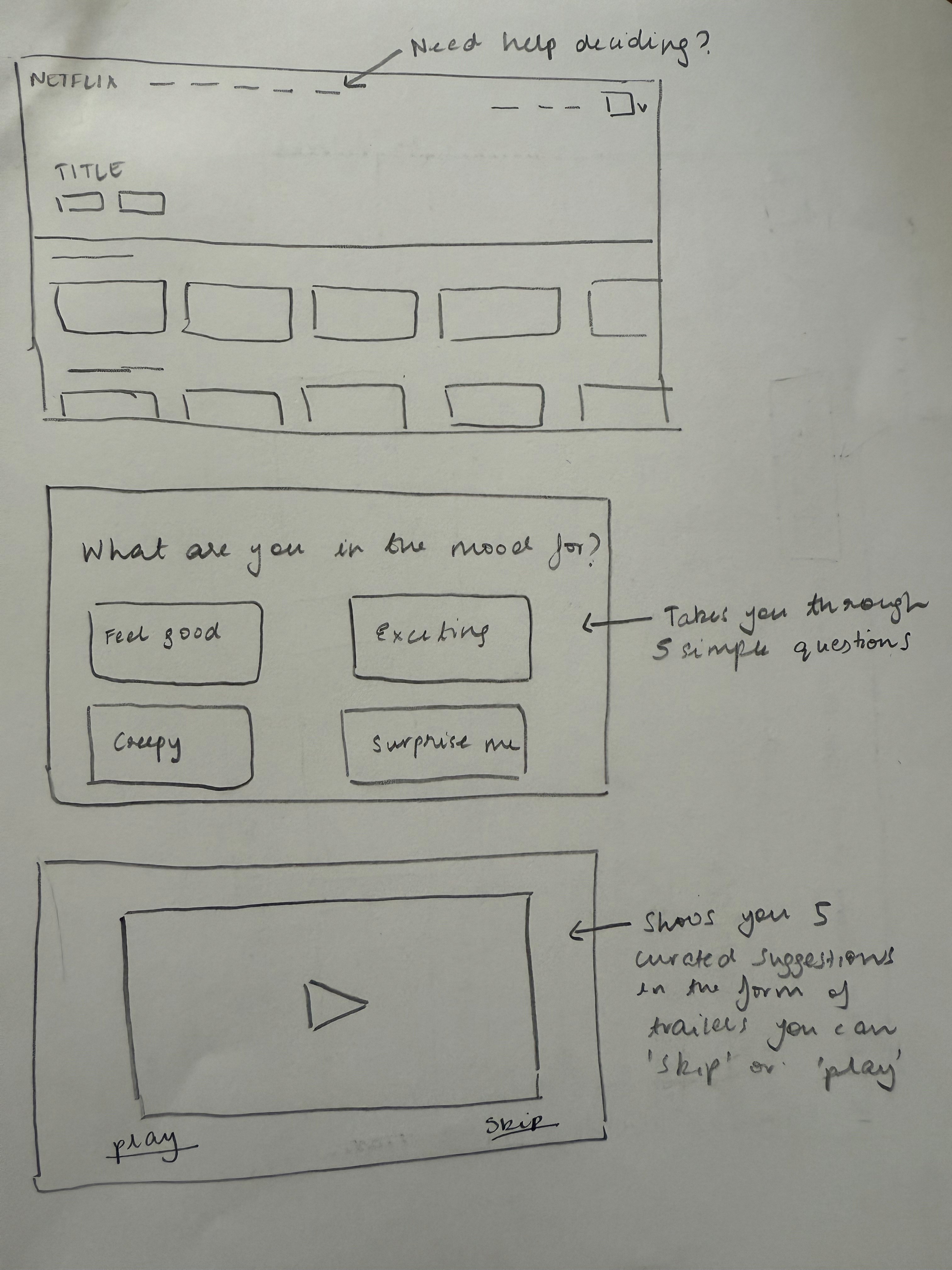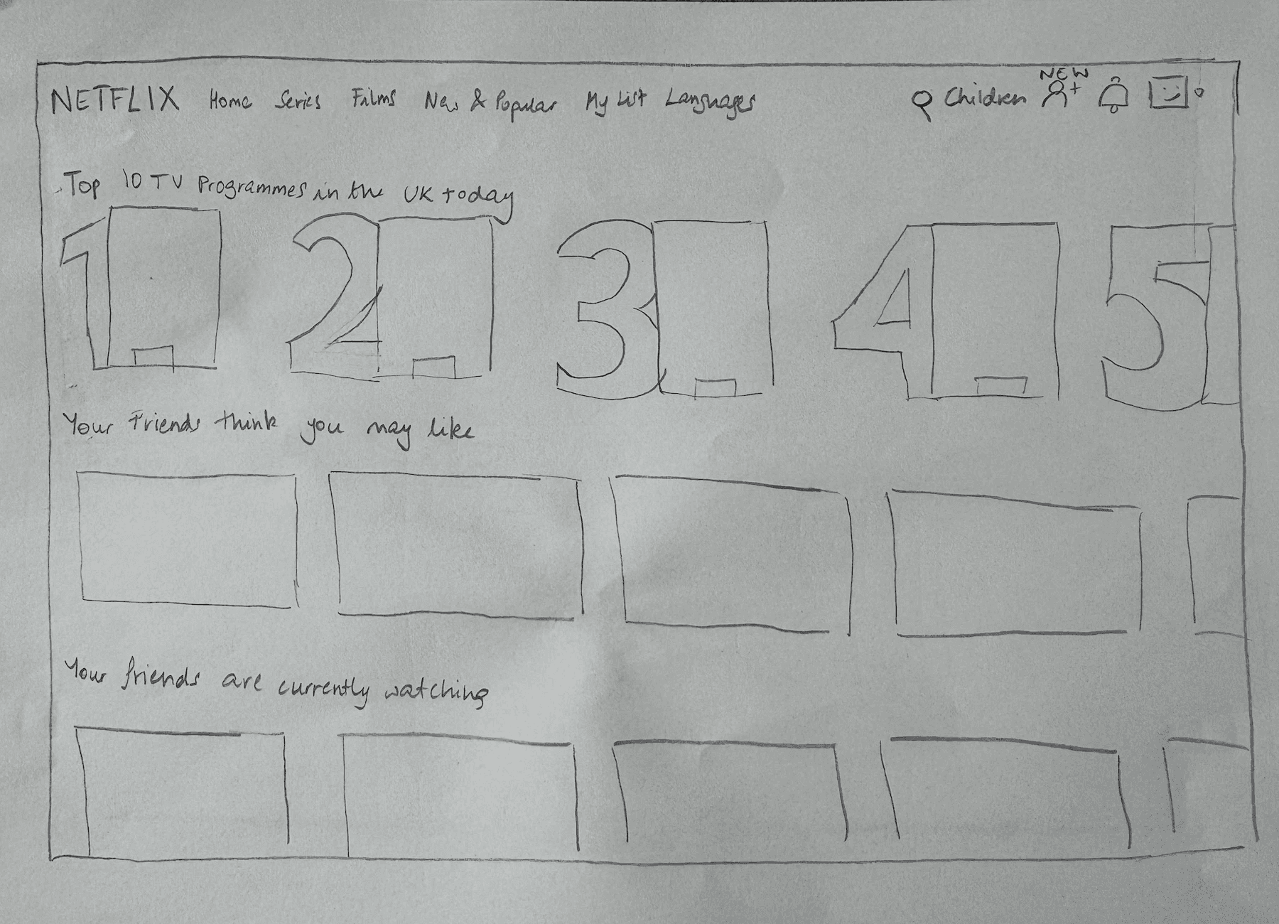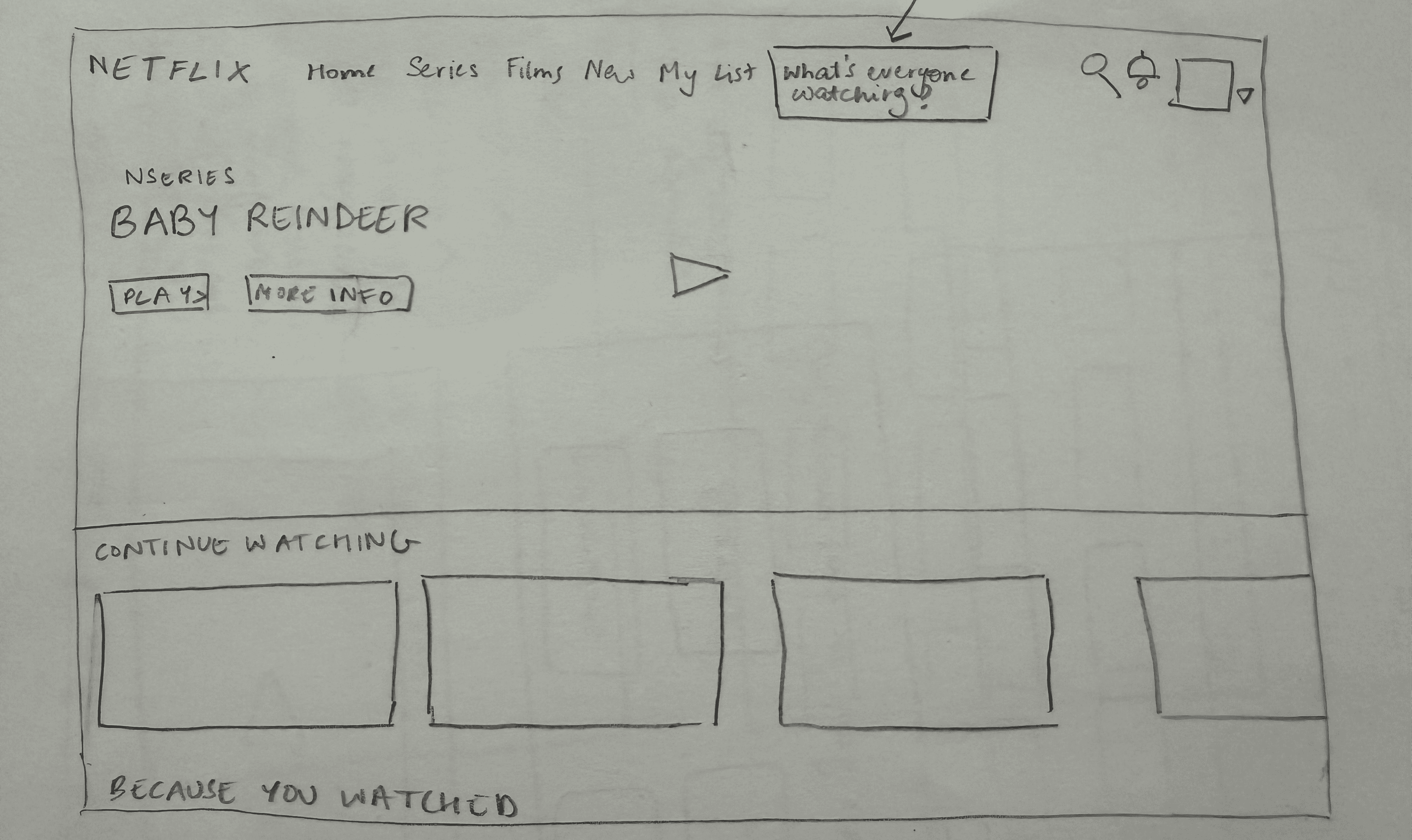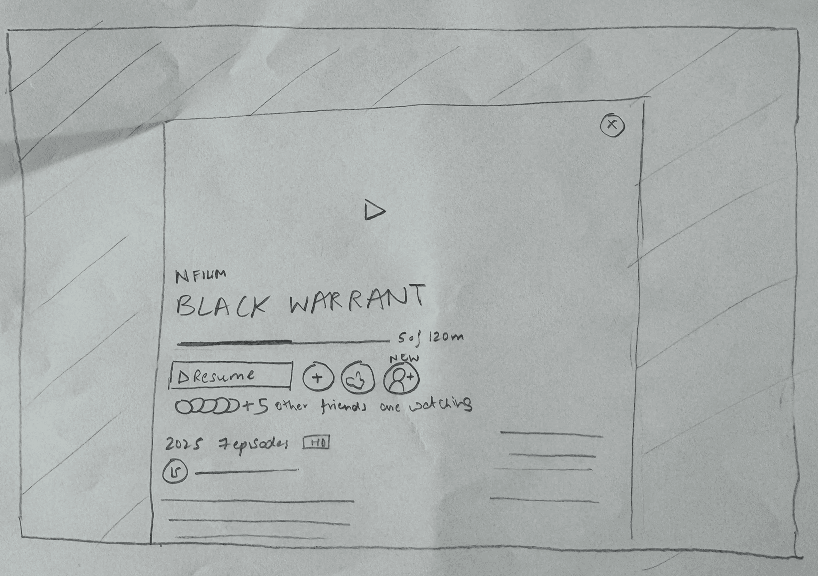 I started by closely observing Netflix's existing patterns—how they introduce new features, as well as their patterns for onboarding, navigation, and visual hierarchy. I sketched social features based on these established patterns, ensuring new elements would feel familiar.