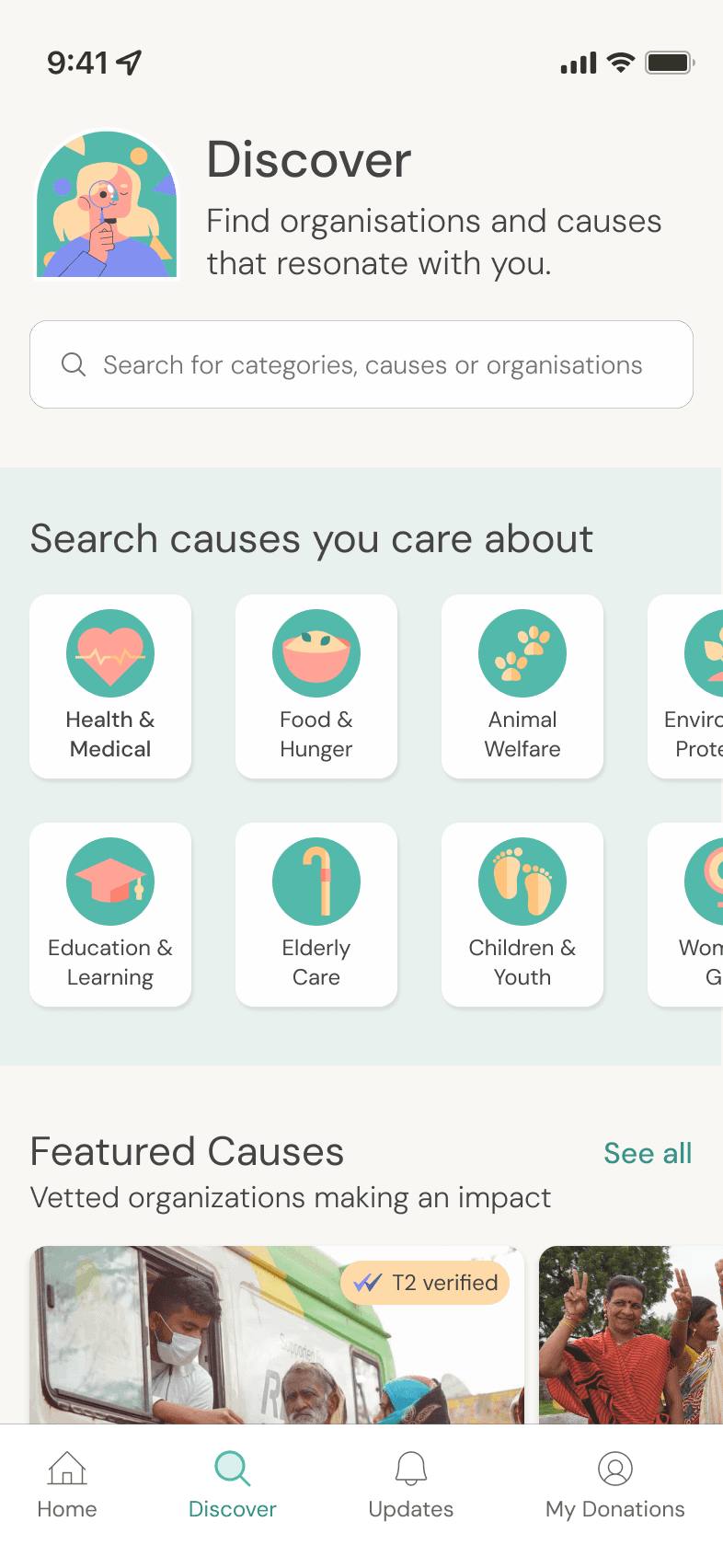 Personalized discovery of non-profits based on causes (e.g. hunger, education, animals etc.)