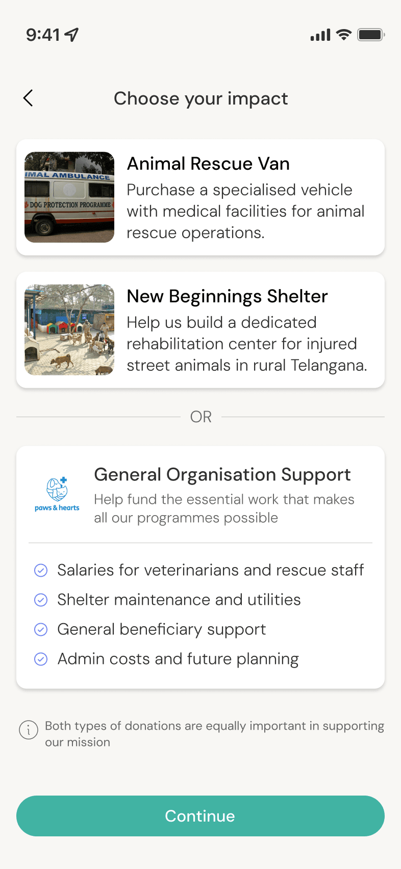Added a step to the donation process that presents both options—specific fundraisers and general organisational support—making it clear these are separate opportunities